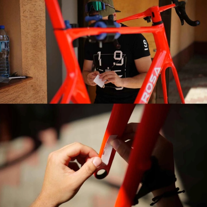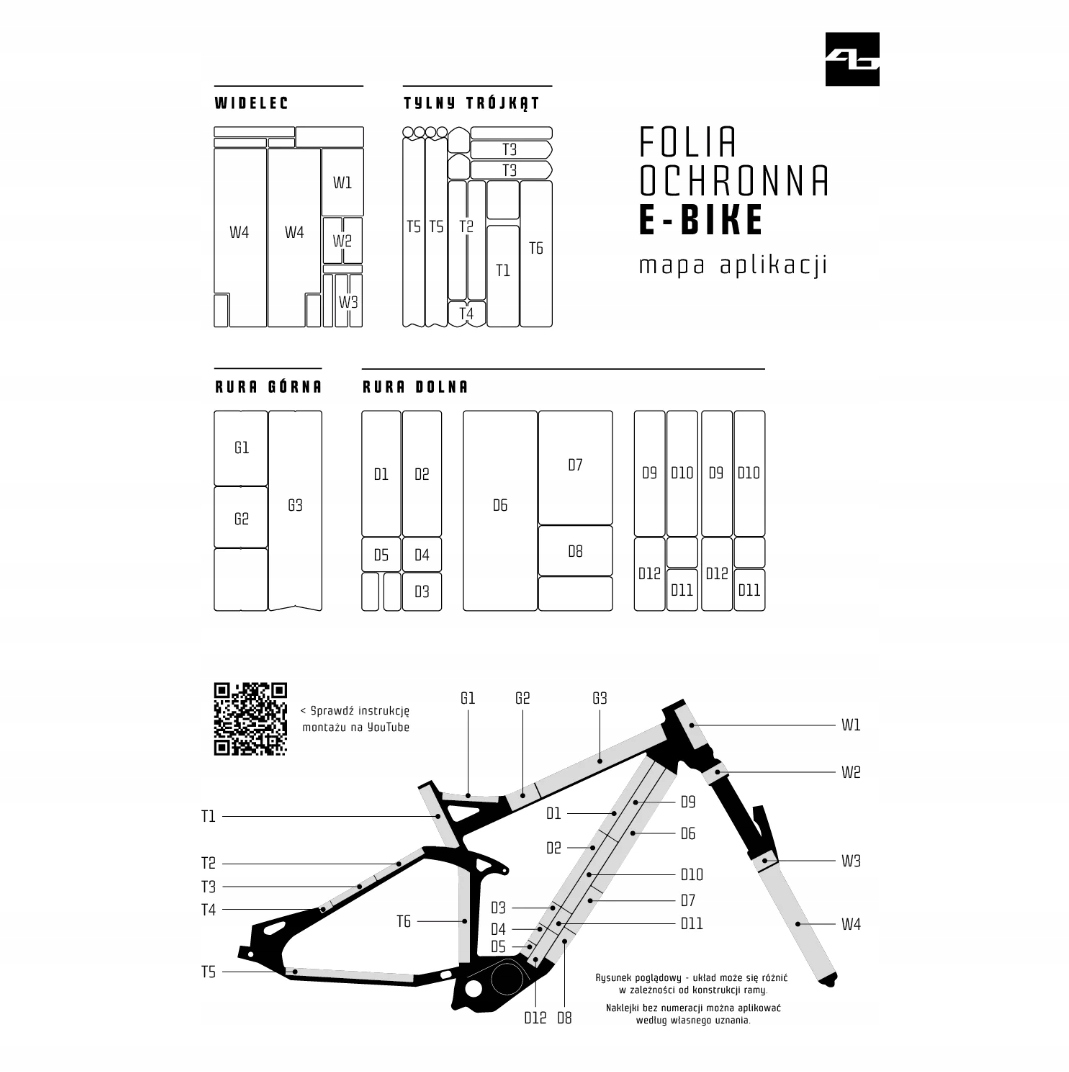 W zestawie można znaleźć mapę aplikacji oraz instrukcję oklejania roweru folią z ponumerowanymi elementami folii ochronnej oraz rozpiską z przyporządkowaniem ich do poszczególnych elementów ramy.